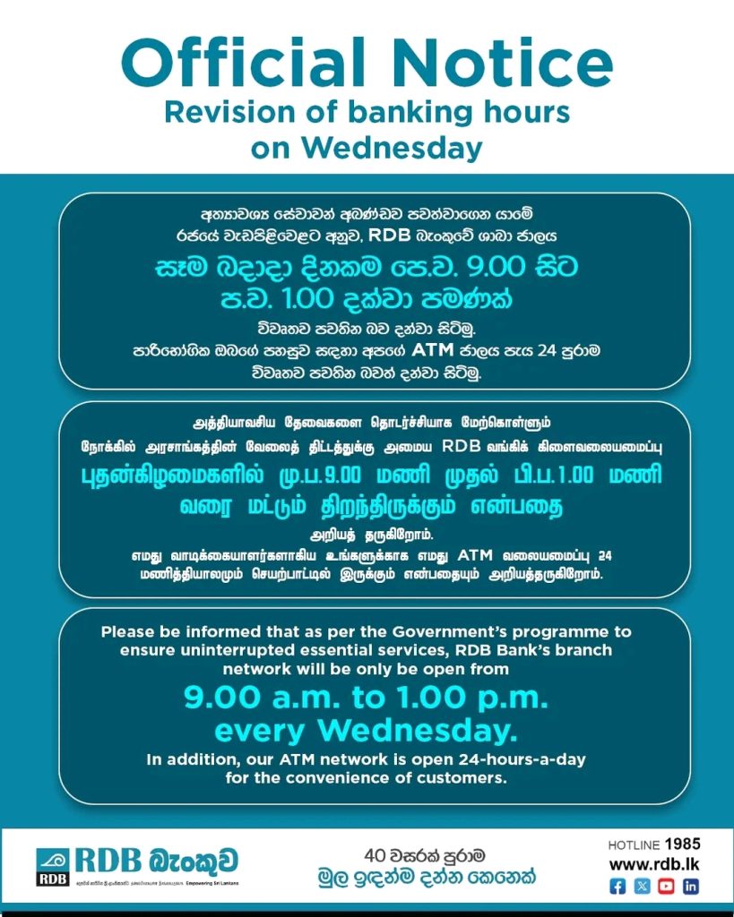 - විශේෂ නිවේදනය – බදාදා දින ගණුදෙණුකරන වේලාවන් සංශෝධය මාර්තු 24, 2026