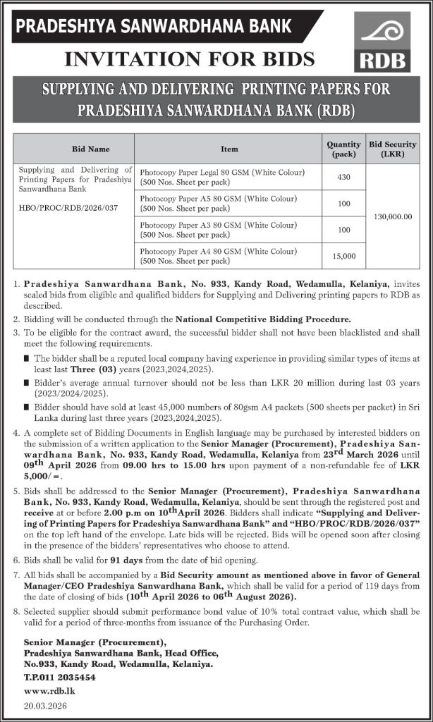 - Supplying and Delivering Printing Papers for RDB மார்ச் 20, 2026