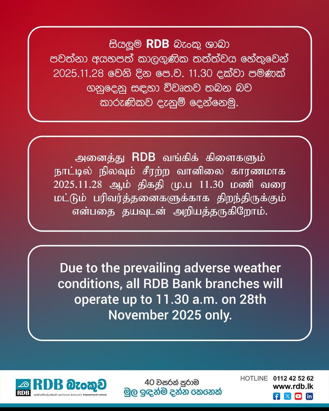 - 6 RDB branches are temporary closed on 01.12.2025 due to adverse weather conditions December 1, 2025